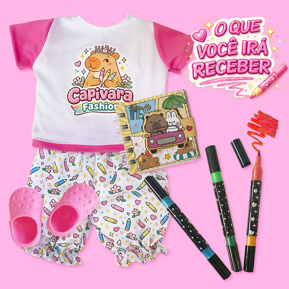 KIT CAPIVARA COM ROUPINHA + LIVRINHO PARA COLORIR + CANETINHAS COM GLITER